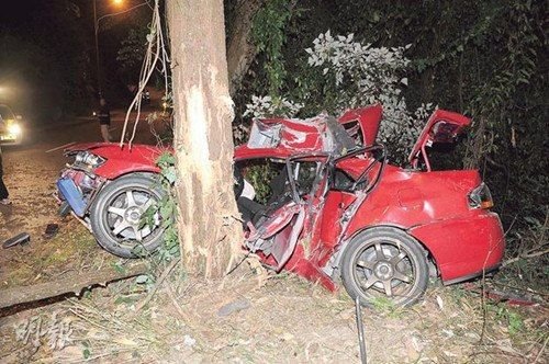 | 猛烈撞擊下車(chē)身呈形扭曲夾緊樹(shù)干。圖自香港.. |