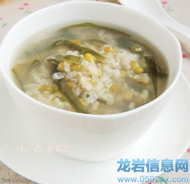 5、綠豆海帶粥:綠豆30克,水發(fā)海帶50克,紅糖適量,糯米適量。水煮綠豆、糯米成粥,調(diào)入切碎的海帶末,再煮3分鐘加入紅糖即可。