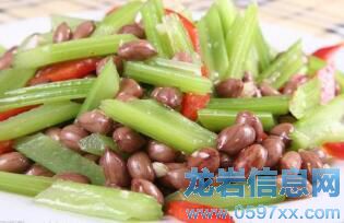 花生拌芹菜做法:將50克花生仁煮熟,250克芹菜莖清洗干凈,切成小段并用開水焯一下,二者裝盤,加入適量的鹽、味精、鮮味汁(或香油)拌勻即可食用。