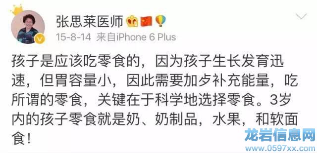 那么,孩子真的完全不能吃零食嗎?NO!關(guān)于孩子吃零食的問(wèn)題,“張奶奶”的張思萊在微博上表示,孩子是應(yīng)該吃零食的!因?yàn)楹⒆由L(zhǎng)發(fā)育迅速,但胃容量小,因此需要加餐補(bǔ)充能量。方便取食的零食,是媽媽們不錯(cuò)的選擇。