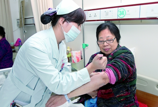 昨日,重醫(yī)附二院內(nèi)分泌科,護(hù)士為劉婆婆注射胰島素。