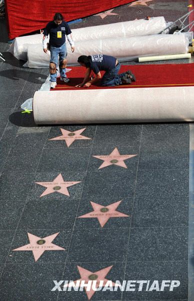 2月18日,工人們在美國加利福尼亞好萊塢柯達劇院前鋪設(shè)紅地毯。新華社/法新