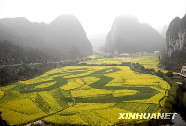 新華網(wǎng)2月20日報道2月18日,在貴州省安順市龍宮風(fēng)景區(qū)大片金色的油菜花叢中,一個由種植的胡豆形成的巨大繁體“龍”字清晰可見。新華社發(fā)(喬啟明 攝)