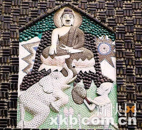 壁畫也是用啤酒瓶做成。 新京報(bào)2月20日報(bào)道 一座位于泰國和柬埔寨邊界的寺廟里的僧侶歷時(shí)20余年,用上百萬個(gè)玻璃啤酒瓶建起了他們的廟宇。