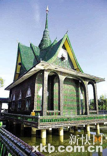在修建這些房子時(shí),他們還使用了混凝土做“芯”以確保建筑物的強(qiáng)度,然后用棕色和綠色的啤酒瓶來修建。其中,綠色的瓶子是“喜力”牌啤酒的瓶子,而棕色的是泰國本地“象”牌啤酒的瓶子。寺里一些墻上的佛像也是由回收的啤酒瓶蓋和啤酒瓶碎片拼成的。