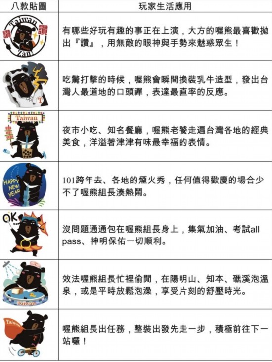 中國臺灣網(wǎng)11月29日消息 據(jù)臺灣媒體報道,臺灣版的官方吉祥物出爐!臺當(dāng)局“觀光局”為推出臺灣觀光貼圖,委托曾與日本HelloKitty角色原創(chuàng)者合作卡米爾公司,創(chuàng)造以臺灣喔熊(Oh!Bear)為主角的8款幽默系列貼圖,并即將于12月3日進駐LINE免費貼圖專區(qū),供民眾免費下載使用。