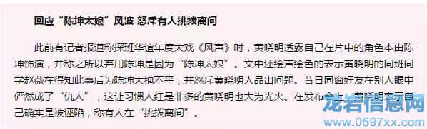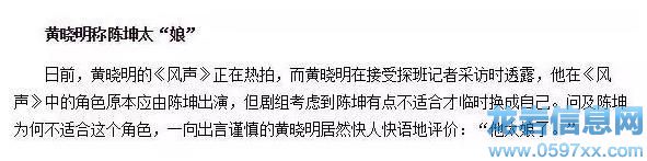 據(jù)稱,當(dāng)時(shí)黃曉明自曝《風(fēng)聲》里自己的角色原來(lái)由陳坤出演,但是私下他卻卻向制片方暗示陳坤太“娘”。