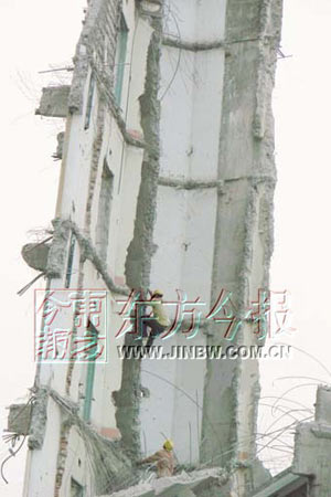 4月2日一組拆遷照片震撼了網(wǎng)友,這組照片在轉(zhuǎn)載時(shí)被稱為“史上最牛拆遷工人”。據(jù)記者調(diào)查,此組照片拍攝的為湛江百園路龍珠大廈的拆除現(xiàn)場,工人在沒有任何保護(hù)措施的情況下爬上20米高的傾斜危墻,連接鋼纜來完成拆遷。