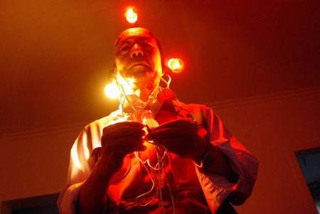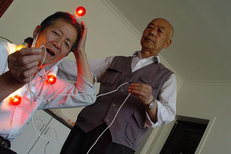 2007年7月6日晚上10點多種,新疆阿勒泰市被人們稱為奇人的張德科家中,親眼目睹張德科老人真實演示220伏電流穿身過的情景。張德科老人在頭上耳朵上掛了6只13瓦的紅、白色小燈泡,一手抓住電線的火線,另一手抓住電線的零線,接通電源后,220伏電流在他身上做為導體,6只13瓦燈泡全量了起來,并且燈泡的量暗程度他還可以控制。張秀科 |