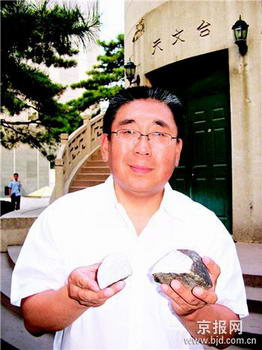 一塊46億歲的隕石穿破時空,砸在了宋老漢面前兩米遠的地上,并因此創(chuàng)下了一個紀錄。昨天,北京天文館隕石專家張寶林將這件珍貴的隕石從玻璃器皿中小心翼翼地取出來,輕輕地放在記者面前,“這是迄今為止國內(nèi)降落地點與人相距最近的一塊隕石標(biāo)本,6月18日被成功收集到北京天文館,距其降落著地僅22天!