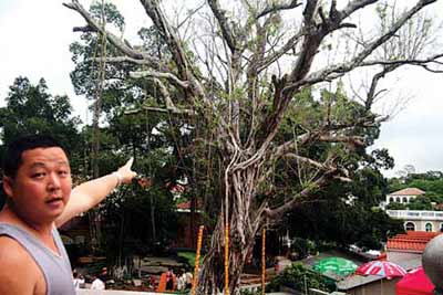 江介紹,綠化科組織噴微生物再生劑,再更換土壤,又從根部到樹枝進行滅菌治療;修理樹枝以減少營養(yǎng)流失,將樹圍擴大增加其樹根的土壤范圍,還修理氣根等。到今年3月,就開始慢慢發(fā)芽了。