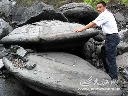 昨日,記者在上饒縣煌固鎮(zhèn)一煤礦看到,數(shù)十塊外形像飛碟的煤矸石散落在大約兩平方公里的礦區(qū)里。專家認(rèn)為,這些飛碟石形成于約3億年前。
