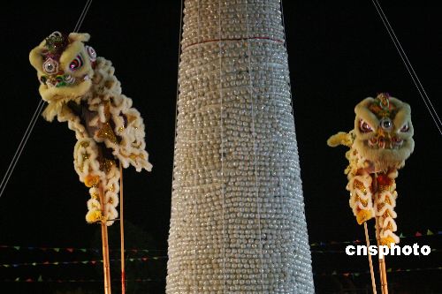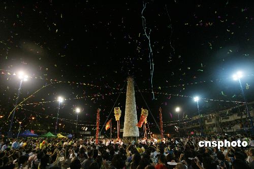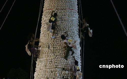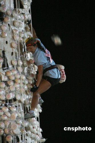 五月二十五日凌晨,香港長洲“包山嘉年華二零零七”的壓軸節(jié)目“搶包山比賽”在北帝廟游樂場舉行,郭嘉明表現(xiàn)出色,蟬聯(lián)個人賽冠軍!皳尠健笔窍愀坶L洲的歷史傳統(tǒng)習俗,摘得包子越多,福氣亦越多,所以每年的活動都吸引數(shù)百名壯男搶包。中新社發(fā)武仲林攝
